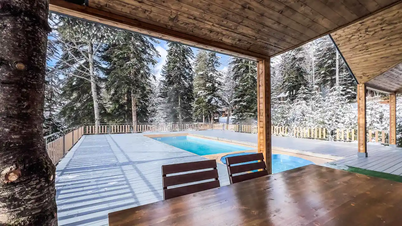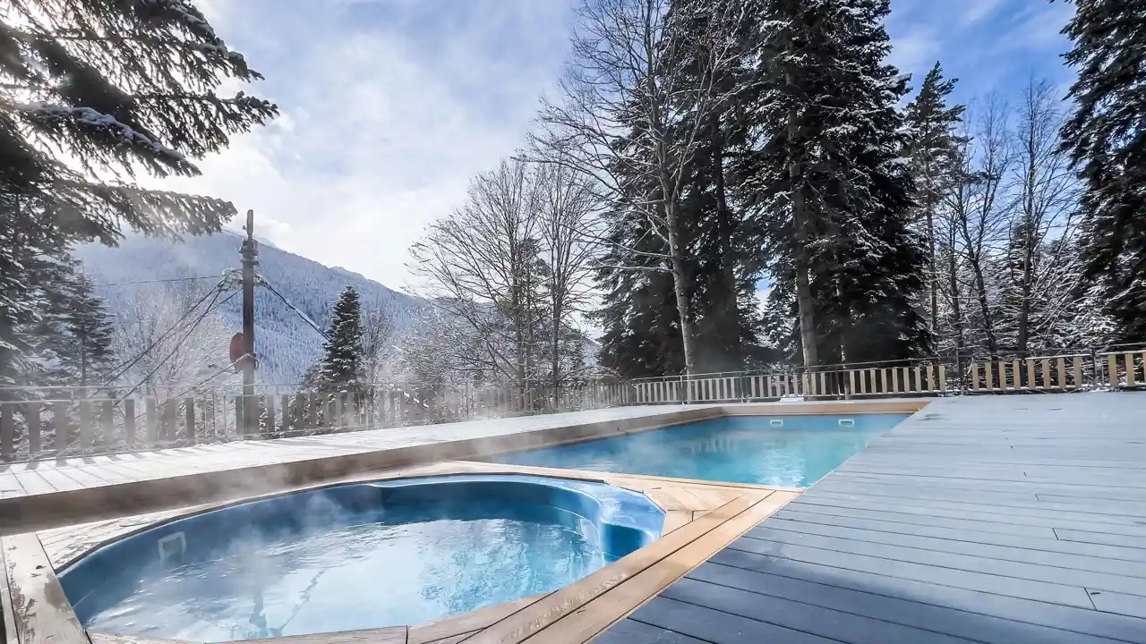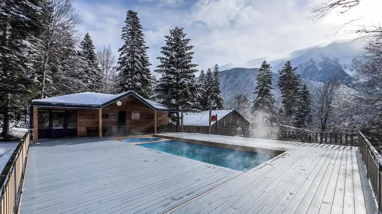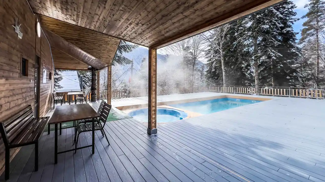Просторный открытый бассейн гостеприимно распахивает свои объятия для больших семей и дружных компаний. Здесь каждый найдет себе место под солнцем, наслаждаясь ласковым теплом воды, которое особенно приятно в прохладные горные дни.